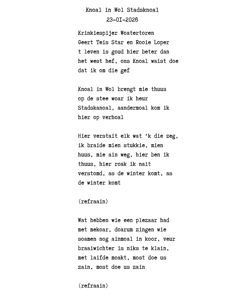 Ter gelegenheid van de opening van expositie Knoal in Wol schreef ik onderstaande tekst. We zongen het vandaag in Museum vd Streek, melodie Take me Home, Country Roads. We zongen ook het Grunneger Volkslaid van Geert Teis. Ging mooi. Rtv Eén maakte een reportage.